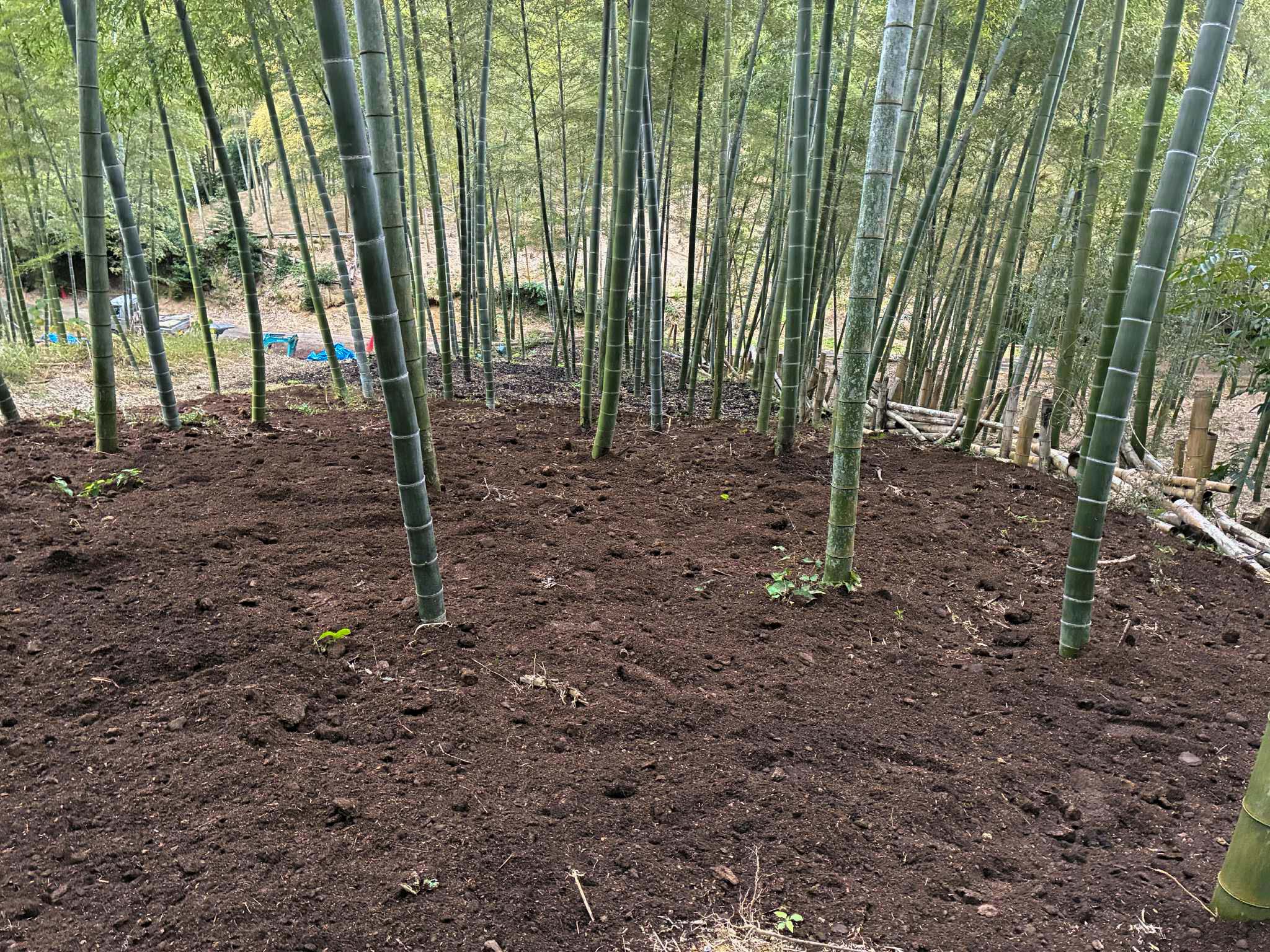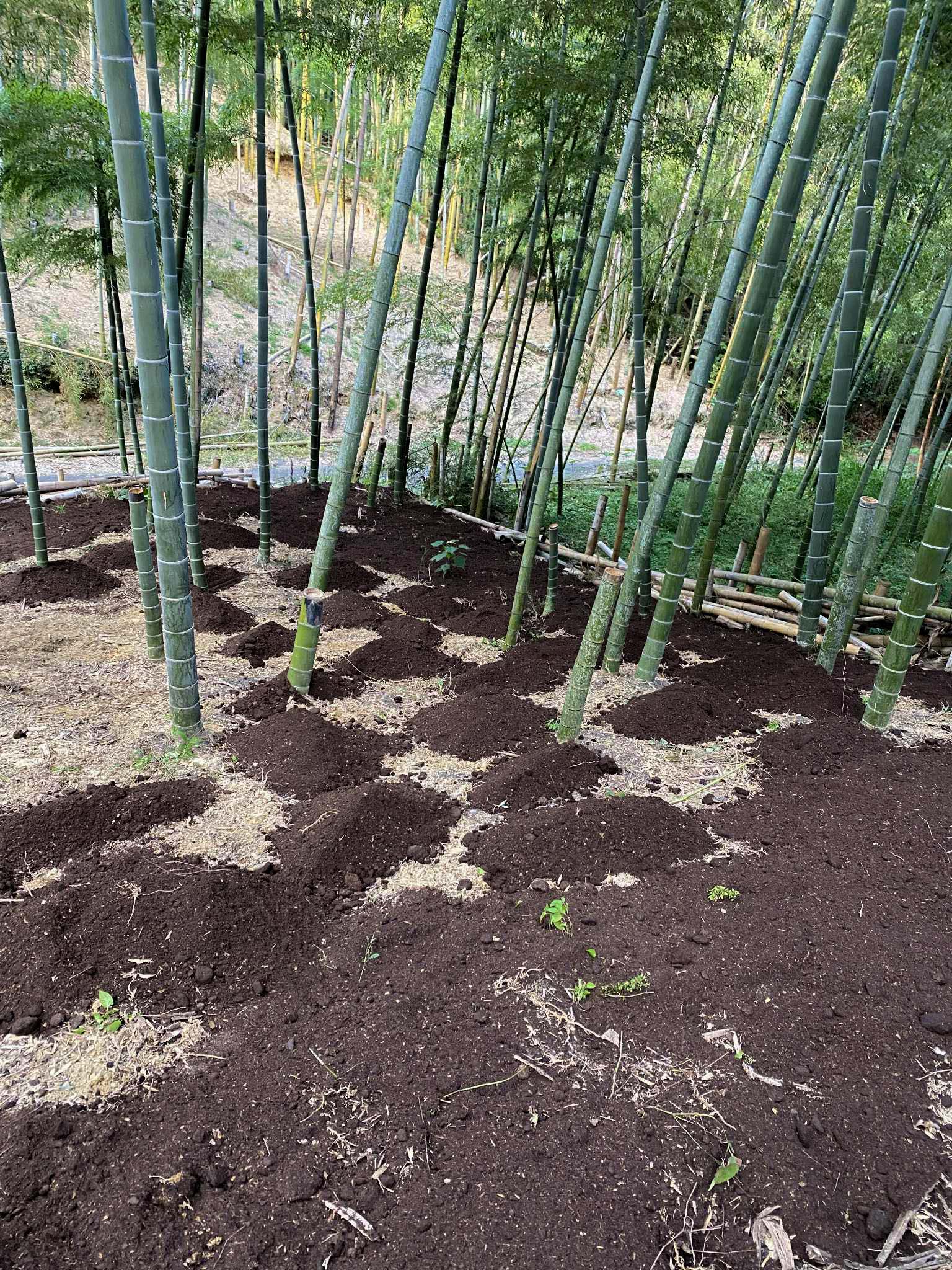 従来ならば秋に竹藪内に稲藁を敷き詰め、冬に土入れ作業を行うのがセオリーですが、