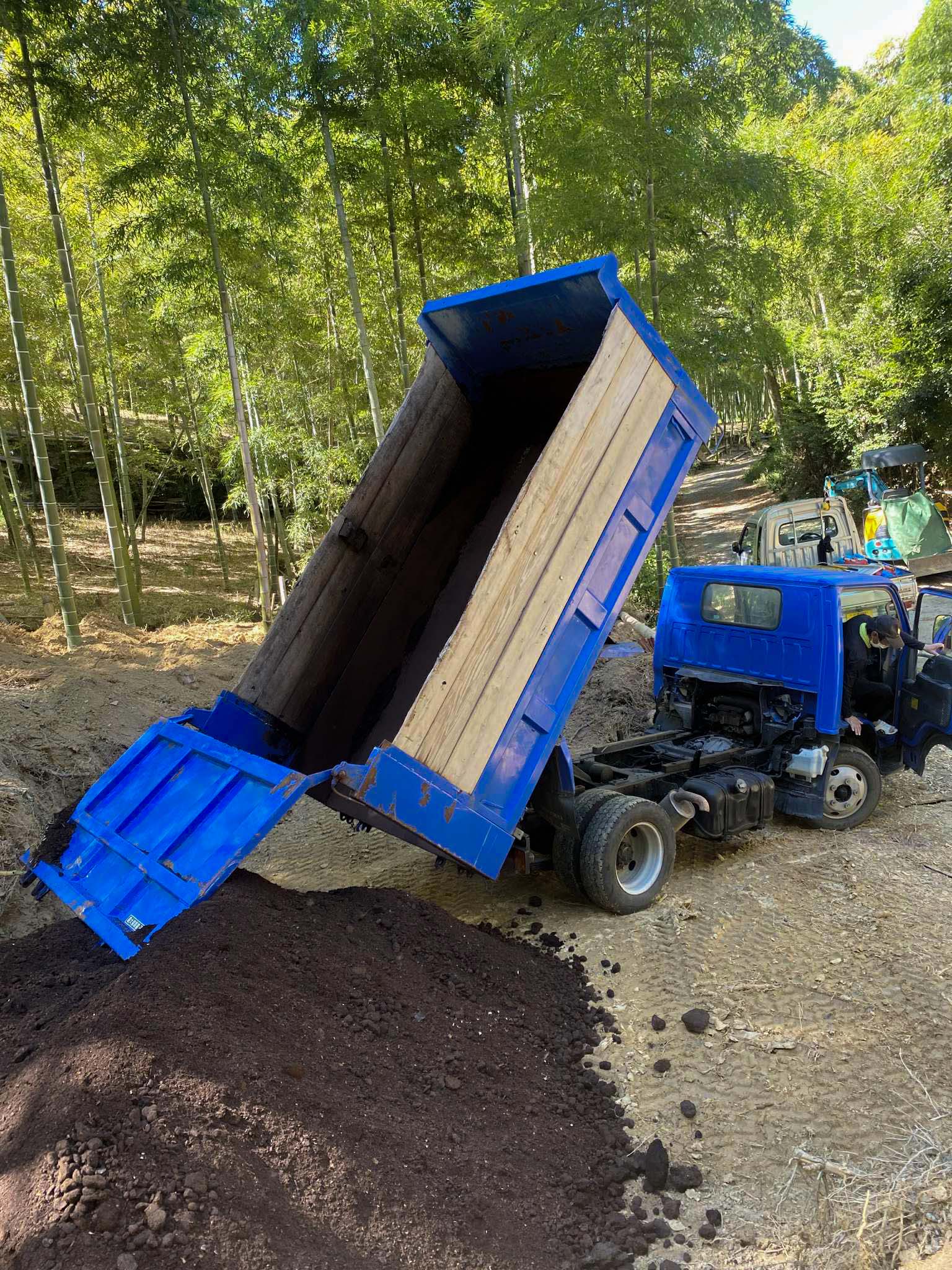 たけのこ旬一では夏終わりから竹藪内に牛糞堆肥を藁の代わりに分厚く敷き詰め、その上に土入れ作業を行います。